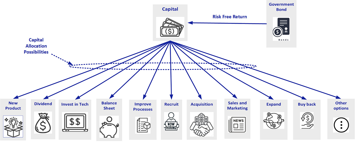 There are several alternatives. If a Leadership team chooses to allocate capital somewhere, they are implicitly stating their conviction that this use of funds will outperform those alternatives. If they are not making this calculation, then it’s a red flag. Or even worse, if they don’t care.